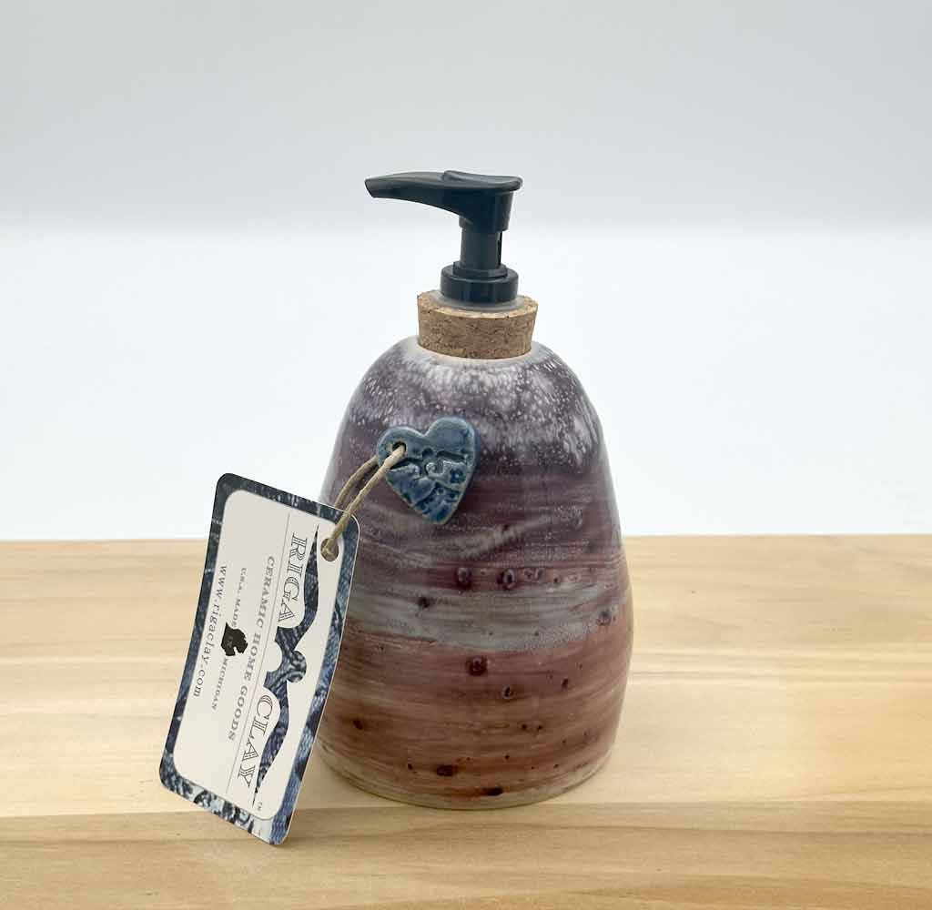 This dispenser is wheel-thrown, hand-patterned, and fired for durability. The Purple Sunset glaze breaks over the surface, revealing soft highlights that feel warm and earthy. Each piece includes a high-quality pump suitable for soap, lotion, or dish detergent.