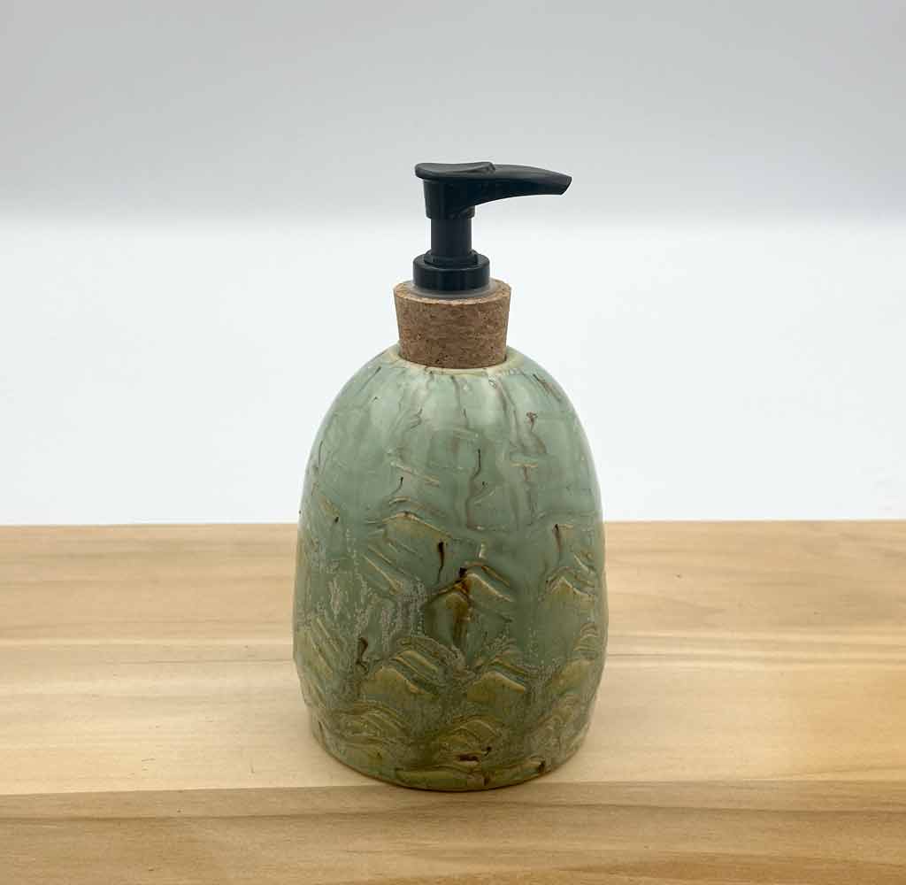 This dispenser is wheel-thrown, hand-patterned, and fired for durability. The Mint Chocolate Chip glaze breaks over the pattern, revealing soft highlights that feel warm and earthy. Each piece includes a high-quality pump suitable for soap, lotion, or dish detergent.